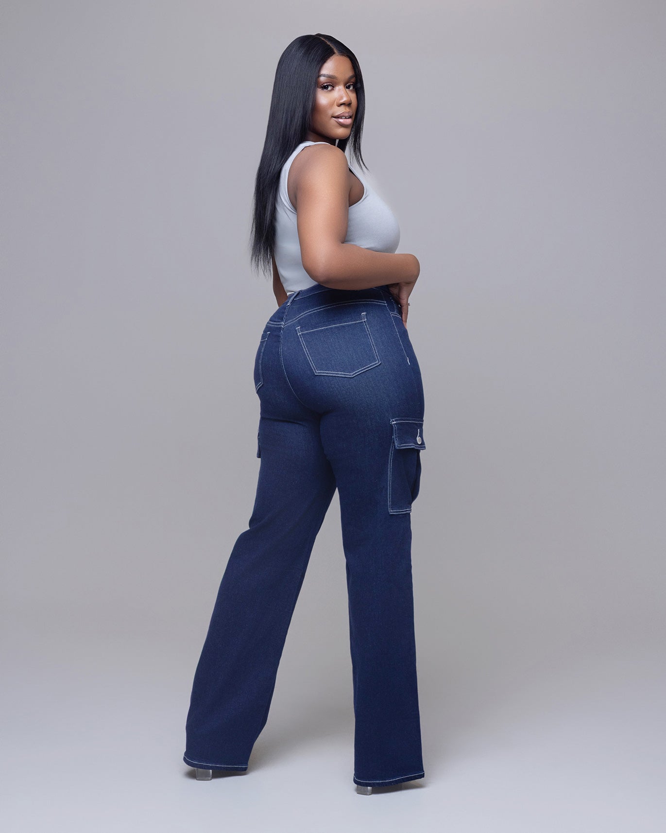 Featuring a high-rise waist for a sculpted silhouette and classic cargo pockets for a touch of utility-chic, these jeans are both stylish and practical. The deep indigo wash makes them versatile for day-to-night wear, whether you're pairing them with heels for a polished look or sneakers for casual cool.